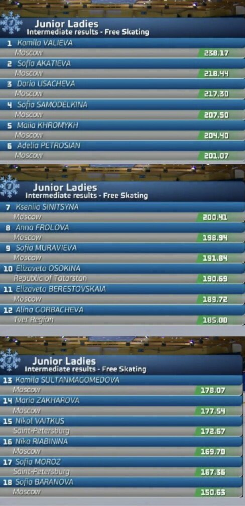 Несколько минут назад закончились соревнования на Первенстве России среди юниоров для девушек. Итоговые результаты выглядят следующим образом: Смотреть выступления наших девушек - одна удовольствие, это действительно прекрасно! Настоящий цвет фигурного катания, эстетики, техничности и красоты. В первую очередь, хотелось бы поблагодарить тренеров за их невероятно тяжелую работу. Вы в буквальном смысле этого слова воспитываете этих чудесных девушек и вкладываете в них свою душу. Тренерский штаб Хрустального - великий, и, думаю, стоит ещё раз сказать им отдельное спасибо, каждому тренеру и хореографу. Но также хотелось бы обратить внимание на Сергея Давыдова, который тренирует не менее прекрасных девушек, но в стенах ЦСКА, и, думаю, вскоре мы увидим их на большой арене взрослого фигурного катания. Очень красивые постановки и особенный респект за выбор музыки. Браво вообще всем тренерам за движение фигурного катания вперёд! Браво девушкам! Каждая из вас уникальна и прекрасна. Спасибо за