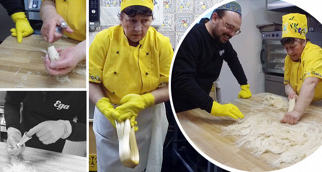 Нам повезло снять, как делает эту сладость настоящая мастерица — Лилия Гильмутдиновна Байкеева, заслуженный работник сферы обслуживания населения Республики Татарстан. Она работает в «Татарской усадьбе», одном из лучших ресторанов Казани, — там все это и случилось.