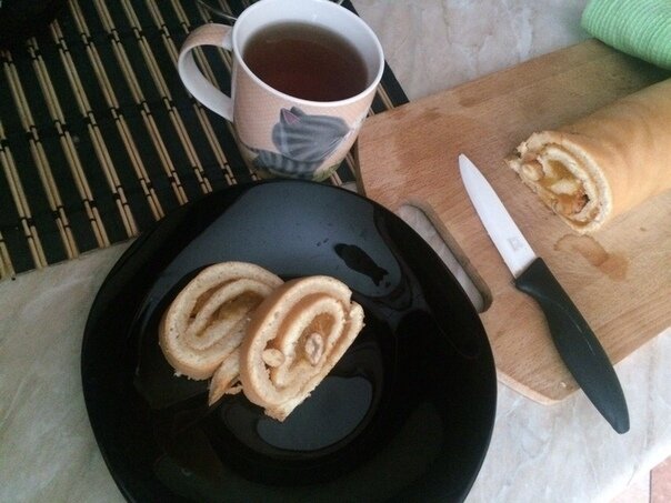 На противень на хорошо промасленную бумагу для запекания равномерно распределить тесто. В хорошо разогретой духовке выпекать минут 10-15 (смотреть по готовности). Далее тесто нужно накрыть чистым полотенцем, перевернуть, аккуратно снять бумагу для выпечки (тесто нежное, поэтому я постепенно ее снимаю, иногда помогая себе ножом). Распределить по тесту начинку. И скрутить рулет, помогая себе полотенцем. Если есть, можно посыпать сахарной пудрой сверху, у меня не было. В оригинальном рецепте сначала на противень выкладываются тертые свежие яблоки, присыпанные корицей, потом все это заливается тестом.