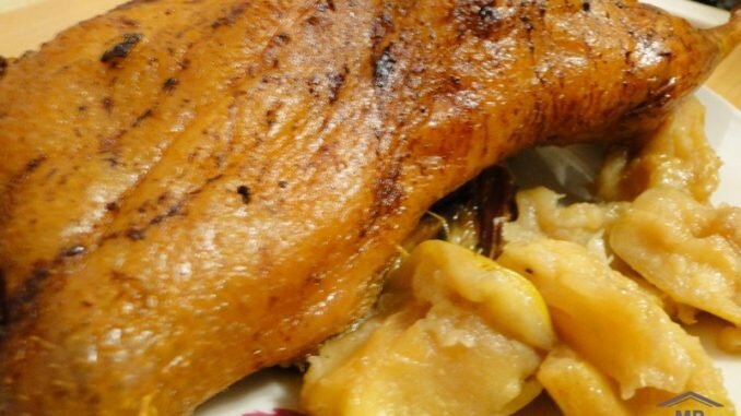 Утка с яблоками, запечённая в духовке, имеет неповторимый аромат, нежнейшее мясо и превосходный вкус! Ингредиенты: тушка утки, 1 столовая ложка соли, 1/3 столовой ложки молотого перца, любимые специи, майонез — по желанию. Процесс приготовления: Тушку утку моем, очищаем от перьев и внутренностей. Слегка придавливаем бумажным полотенцем по тушке удаляя лишнюю влагу. На хвосте утки сверху находится маленький бугорок (железа) — её удаляем. Выбирая тушку утки учитывайте, что в процессе выпекания она немного уменьшится в размерах. Смешиваем соль, перец и специи. Этой смесью натираем всю утку. Натирать тушку можно не только снаружи, но и внутри. Можно также обмазать её всю майонезом. В таком виде даём нашей тушке утки промариноваться 2 часа. Яблоки разрезаем на четыре части, удаляем в них сердцевину. Укладываем дольки яблок внутрь утки. Разрез зашиваем, чтобы выделяющийся при запекании жидкость не вытекала. А ещё так мясо утки станет более сочным и нежным. Форму для запекания смазываем рас