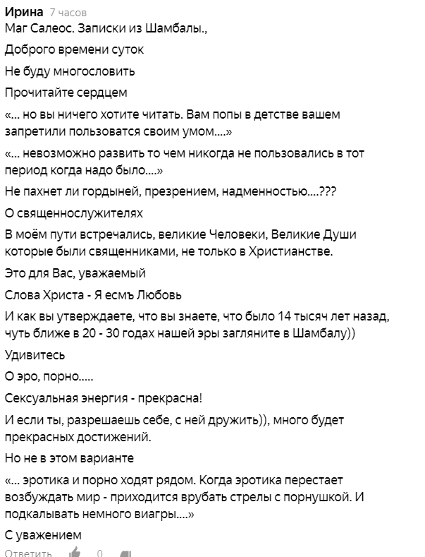 вот как то так. Насчет 20-30х годов - я понимаю к чему отсылка. к историческим фигурам, Адольфу Гитлеру, Елене Блаватской - о первом я уже както писал. О второй еще напишу. Без приказа первоиерарха ни одной войны в мире не бывает. Ошибка Гитлера что он пошел воевать с той землей, откуда он брал свое знание. Изначально у этой фигуры была чуть иная программа. Мы даем благо, но мы не виноваты что человек слаб и порой употребляет свободное знание во вред. За это спрос с тех кто употребил. Впрочем и инструмент "война" тоже служит к выравниванию баланса. Как нибудь разберу лики четырех всадников, есть у меня такое желание. Я сам знаю, что этими статьями я очень сильно рискую. Ибо непонимание в жизни общества изза невежественности и нежелания принимать - играет значительную роль и отрицательно влияет на того кто это выкладывает. Завистников и извратителей всегда хватало. Во все времена. В конце концов - где в моих словах какая либо пропаганда или разжигание? Нету таковой. Если вам кажется что есть - покажите где, остановлюсь, раскрою подробнее или исправлю мысль изреченную, ибо она порой бывает ложной. Сорняки среди семян попадаются. Люди склонны идеализировать высшие силы, не веря в то что и они порой в тонком плане занимаются тем что на земле именуется развратом. Это к моему пассажу о эро и порно. Сами по себе явления именуемые фетишами или "отклонениями" не греховны, но могут приводить к заболеваниям. Например к СПИДу. Но это ваша невнимательность. В самих явлениях - кроме некоторых которые осуждены и законами тонкого плана (об этом подробно было разобрано в 10 части записок) тогда карается кармическим воздаянием. Законы того плана отображены в вашем уголовном кодексе. Поэтому дублирование в виде религиозных ограничений и искажений - если в государстве принят УК и АК - уже не имеет полезности и смысла, а служит только к возникновению крайностей психологического и психиатрического рода. Цивилизация что именовалась Шамбалой, когда она была еще проявлена физически - была высокоразвитой. Мы летали тогда... хоть у нас и другие тела были, по воздуху, но не сами. В виманикашастре описано как. И будет еще время когда эти экологичные технологии будут поняты и возрождены вновь. Но прежде чем это будет - придется пройти ускоренный курс осознания кто вы есть и пугатся этого не стоит. Этот курс уже идет, и тот "сбор урожая" и прополка сорняков о котором писалось в 15 главе - один из инструментов достижения сего. Не мытьем так катаньем. Когда то давно древние отцы современного человечества обьявили нам войну. И это стало причиной лишения власти всех или почти всех иерархов. В той войне погибли почти все.. остальные выжили и известны ученым как неандертальцы и прочие, просто тогда мутации были.. последствия радиации, все такое. А на конец света не найдейтесь. Надейтесь на свою внутреннюю суть скрытую в личной тьме. И ее исследуя -исследуйте себя и мир. Работа у меня такая в данном воплощении - обнаруживать и боротся с проявлениями искажений и убирать энергетический мусор разными путями. Ведь Карма тоже бывает двух типов, есть карма человека, а есть карма духа. И это не одно и тоже. у продолжений Сущего как нас можно именовать - карма считается иначе. И отрабатывается порой не за одно воплощение... Процесс растягивается на многие тысячелетия. А потерявший престол иерарх - посте