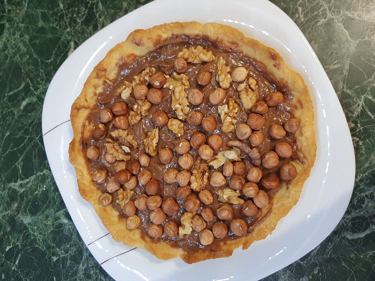 Ореховый тарт Нам понадобится: Масло сливочное - 120 грамм Мука - 180 грамм Яйца - 1 шт. Шоколад - 300 грамм Творожный сыр - 140 миллилитров Орехи - 100 грамм, (у меня грецкие и фундук) Мягкое сливочное масло растираем с мукой, добавляем яйцо и замешиваем тесто. После того замешали тесто, убираем на 30 минут в холодильник. Пока тесто в холодильнике, займёмся начинкой. Растапливаем шоколад на водяной бане. После того как растопили шоколад нужно чтобы он немного остыл. Затем смешиваем шоколад с творожным сыром. Достаём тесто из холодильника и распределяем его по форме (фото номер 3). Отщипываем от теста небольшие шарики и залепляем ими все дно формы для запекания. Также формируем бортики - где-то 3 см в высоту. Выпекаем в духовке только основу, минут 30 при температуре 180 градусов до золотистого цвета. Достаём из духовке, даём немного остыть. Выливаем шоколадную начинку и сверху посыпаем орехами. #рецепты #ореховыйтарт #шоколадныйторт