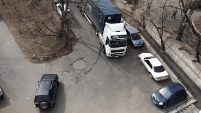 Как мы видим водитель фуры заехал не в очень удобное место. Так как места для разворота абсолютно нет. Сбоку на дороге стоят автомобили (якобы на парковке), а с другого бока машины уже непосредственно ездят.