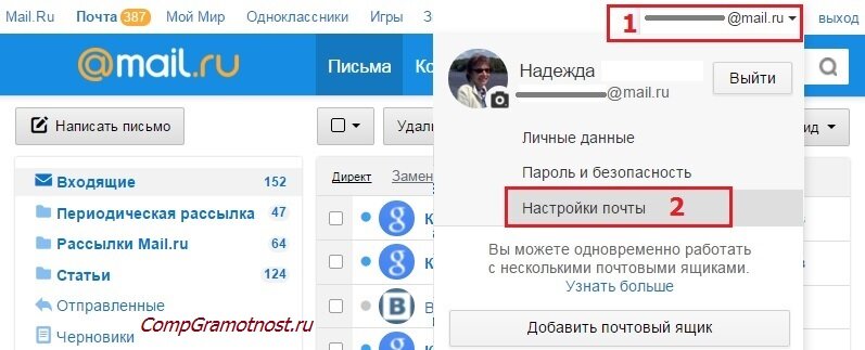 3) в правом верхнем углу кликнуть по своему логину. Откроется меню, в котором надо щелкнуть “Настройки почты” (2 на рис. 1):