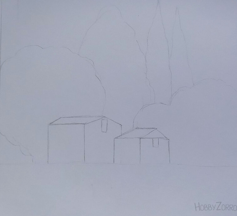 41й день ежедневного рисования Всем привет! Сегодня я рисую спиртовыми маркерами. Решила нарисовать картинку, похожую на ту, что рисовала фломастерами с алиэкспресс. Здесь можно глянуть на нее. Для начала быстрый скетч: Перед тем, как раскрашивать маркерами, я рисунок "подтерла" клячкой. Темно-синим маркером раскрасила гору на заднем плане: Голубым раскрасила небо: Далее приступаем к раскраске первого дерева. Для дерева я взяла 4 зеленых маркера. Начинаем с темно-зеленого, постепенно добавляя более светлые цвета (делаем градиент): Второе дерево раскрашиваем точно так же: Для третьего дерева оставляем три зеленых маркера (самый темный убираем): Для четвертого дерева я подобрала два других цвета (что-то вроде красно-коричневого и оранжевого): Ну и для пятого дерева я подобрала темно-зеленый, болотный (он у меня почти высох) и коричневый (пришлось им закрашивать болотный): Теперь приступаем к домикам. Добавляем им на стены тени (светло-серый маркер) и раскрашиваем крыши: Остался перед