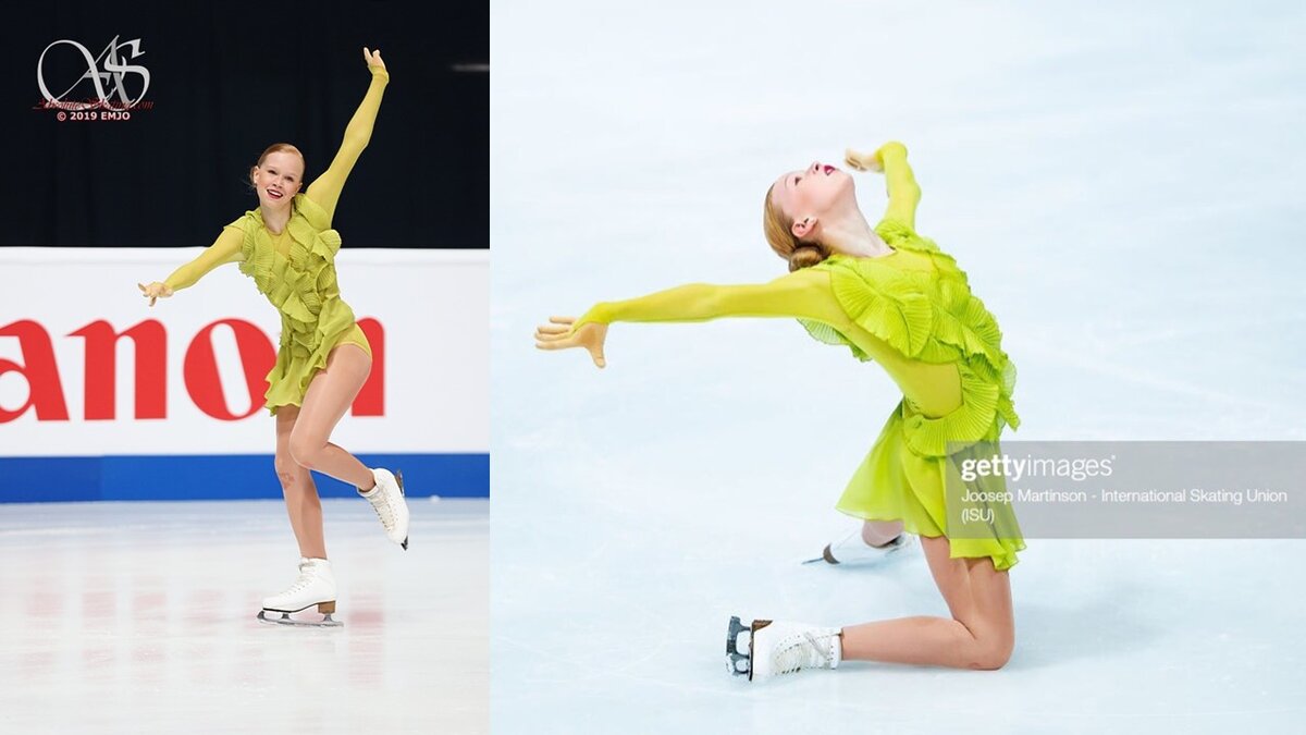 Начнём с Евы-Лотте Кибус, которая в сезоне 18-19 каталась в светло-зелёном платье. Цвет на фотографиях выглядит очень красивым.
