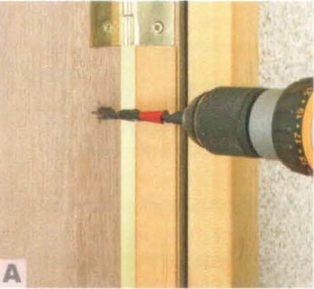 Противосъемные штыри обеспечивают дополнительную надежность двери со стороны петель, чтобы ее нельзя было сорвать или снять. Противосъемные штыри следует ставить как минимум парой - один под верхней и один под нижней петлями. Для дополнительной безопасности можно использовать третий и даже четвертый штыри. Просверлите отверстие в кромке двери, его размеры должны быть указаны производителем. Вбейте конец штыря с накаткой в это отверстие, оставив снаружи гладкий скругленный конец. Прикройте дверь, оставьте метку на коробке. Приложите и обведите накладку, стамеской снимите материал по толщину накладки. Просверлите отверстие для штыря. Приверните накладку шурупами и проверьте, нормально ли открывается и закрывается дверь. Так же ставьте и другие штыри (если требуется).