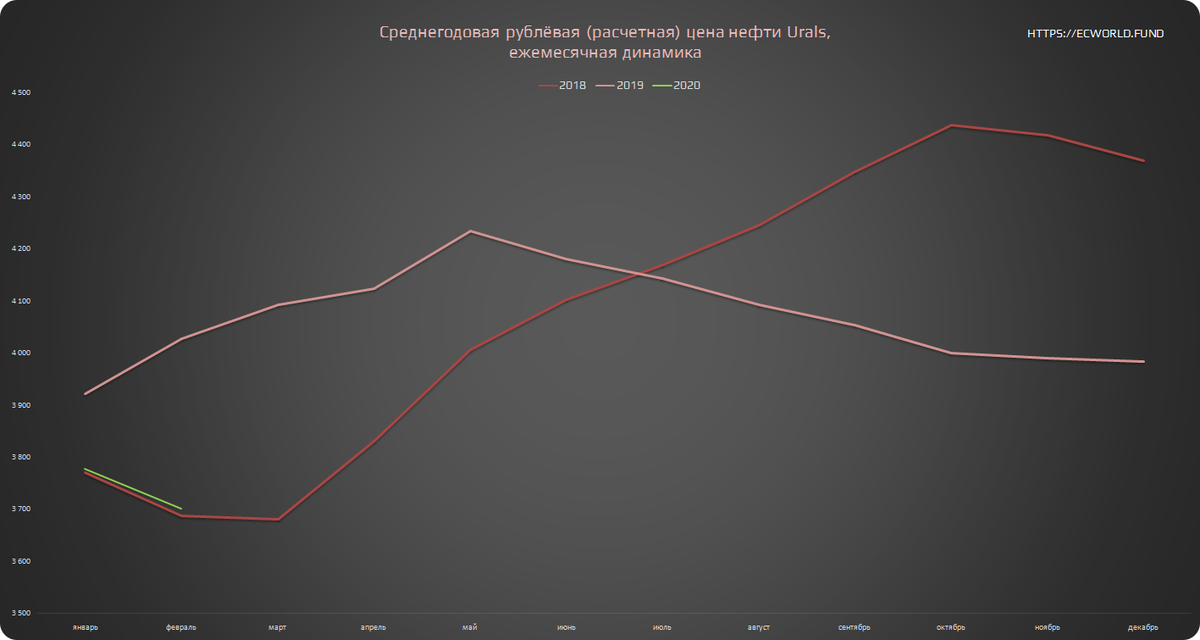 К текущему моменту рублевая цена бочки нашей нефти упала до среднегодовых 3700 (см. зеленую линию на графике ниже), в точности пока копируя динамику «выборного» 2018 года: