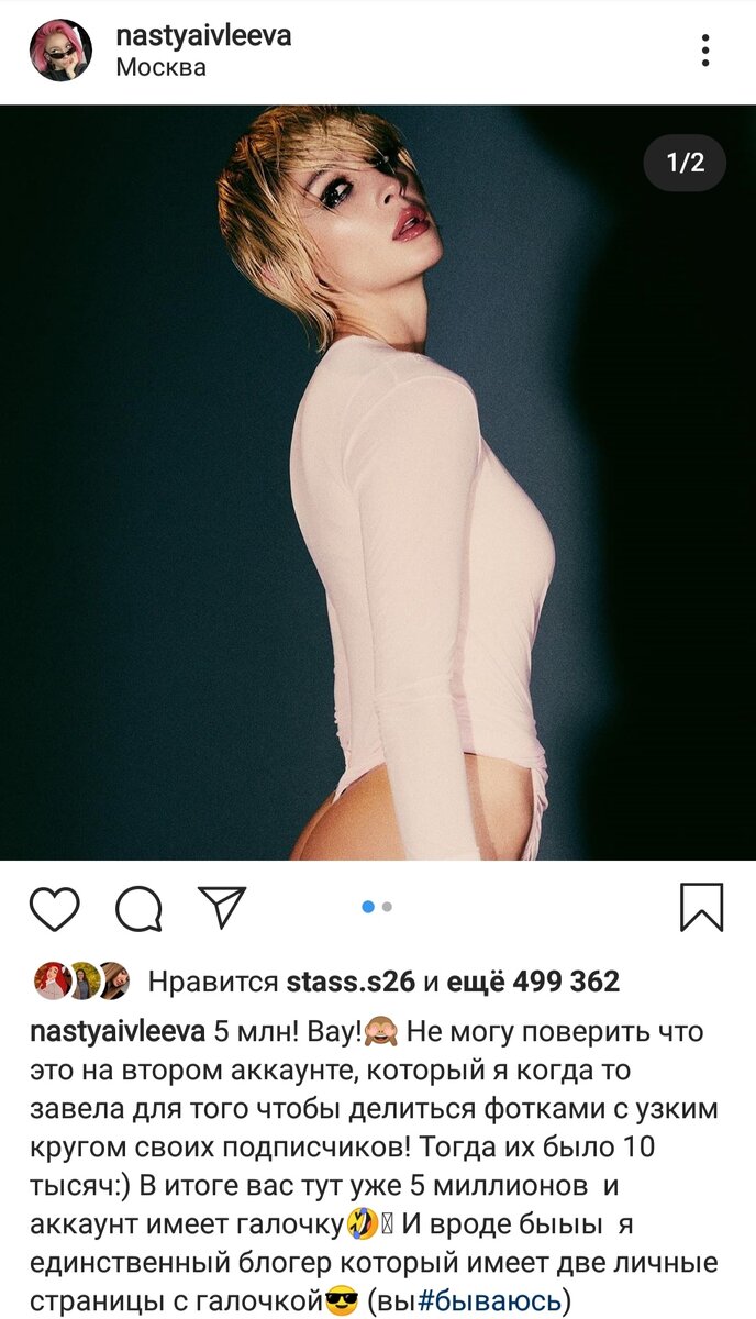 У известной инстадивы Насти Ивлеевой 2 страницы в Instagram. На одной из них, наиболее известной, @agentgirl уже 14, 4 миллиона подписчиков, но также недавно девушка поделилась новостью о том, что на второй странице @nastyaivleeva уже целых 5 миллионов и у аккаунта уже есть галочка. Ивлеева стала единственным блогером, у которого 2 страницы с галочкой. Так, девушка стала самым успешным блогером в России, ведь даже у Ольги Бузовой с 19 миллионами подписчиков, меньше просмотров и лайков на фото и видео. Вторая страничка nastyaivleeva должна была стать личной, для узкого круга - призналась Настя. Однако люди стали подписываться и на неё. И все же страничка более личная. "Многие из новичков не всегда понимают, где смешные видосы и про какую ещё страницу я всегда говорю:) Разъясняю: у меня есть основная страница @_agentgirl_ где я делюсь видео контентом и контентом со всех своих проектов, заходите, смотрите! И есть эта страничка @nastyaivleeva которую уже сложно назвать live. Её можно
