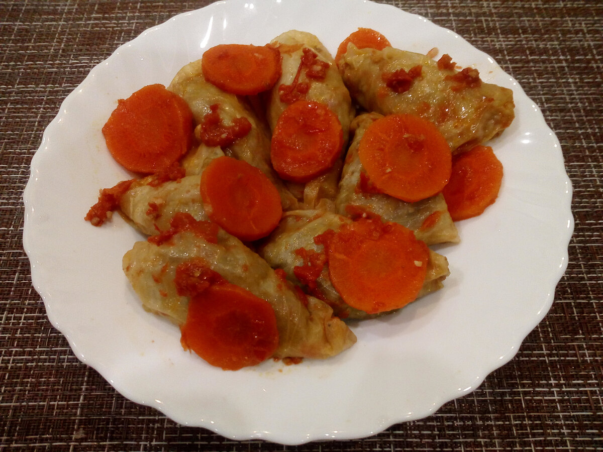 Поверх голубцов я кладу колечки сырой моркови