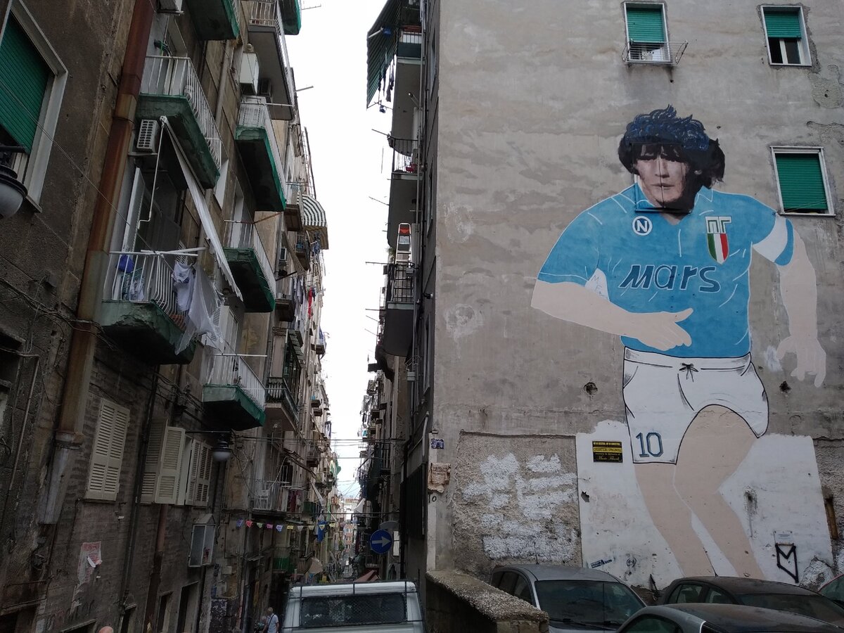 Неаполь — очень колоритный и самобытный город. Он стал вторым для нас после Рима в нашем путешествии по Италии. И, если с Римом все было понятно: мы увидели ровно то, что ожидали, то Неаполь нас заинтриговал, и не раз нам приходилось искать ответы в интернете, чтобы понять его. Первое, что нам бросилось в глаза по приезду в Неаполь, — это вездесущие постеры и граффити с Диего Марадоной. Абсолютно в любом закутке города, на любой улице можно встретить лицо знаменитого футболиста, хоть небольшой стикер, но он точно будет! В любом спортивном баре или киоске, где делают ставки на спорт, можно встретить либо голубую футболку с 10м номером Марадоны, либо его фотографию в рамке на стене. Для справки: Диего Марадона играл в составе футбольного клуба "Наполи" с 1984 по 1992 год. При нем команда достигла небывалых высот и впервые стала чемпионом УЕФА. Встречались даже плакаты, где Марадону изображают как святого. Сколько лет прошло, после того, как 10й номер покинул "Наполи", а культ его личнос