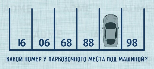 Ответы в конце))) Задача № 1. Парковка Это простой вопрос из гонконгского теста для зачисления в начальную школу Задача № 2. Четырехзначные числа Дошколята решают эту задачку за 5-10 минут. Программисты — за 1 час. Задача № 3. Числовая пирамида Задачки, как эта, сингапурские третьеклассники щелкают как орешки. Задача № 4. Шоколадная коробка Задачка из США для детей 12-13 лет: "В коробке 50 шоколадок. Из них 30 с карамелью, 25 — с кокосом, 10 — и с карамелью, и с кокосом, а остальные вообще без начинки. Вопрос: Какая диаграмма верно отражает содержимое коробки?" 1) Ответ: 87. Надо просто мысленно повернуть картинку вверх ногами 2) Ответ: 2581 = 2. В каждой группе из 4 чисел нужно было всего лишь сосчитать замкнутые кружочки. Например, у цифры 6 один кружочек, у цифры 8 — два. А, значит, у числа 6889 их шесть. И так далее. 3)Ответ: D = 1345; E = 2440. Первым делом складываете два числа в нижнем ряду: 198 + 263 = 461. Получилась сумма больше того числа, что стоит над ними: 461 > 446. Вычи