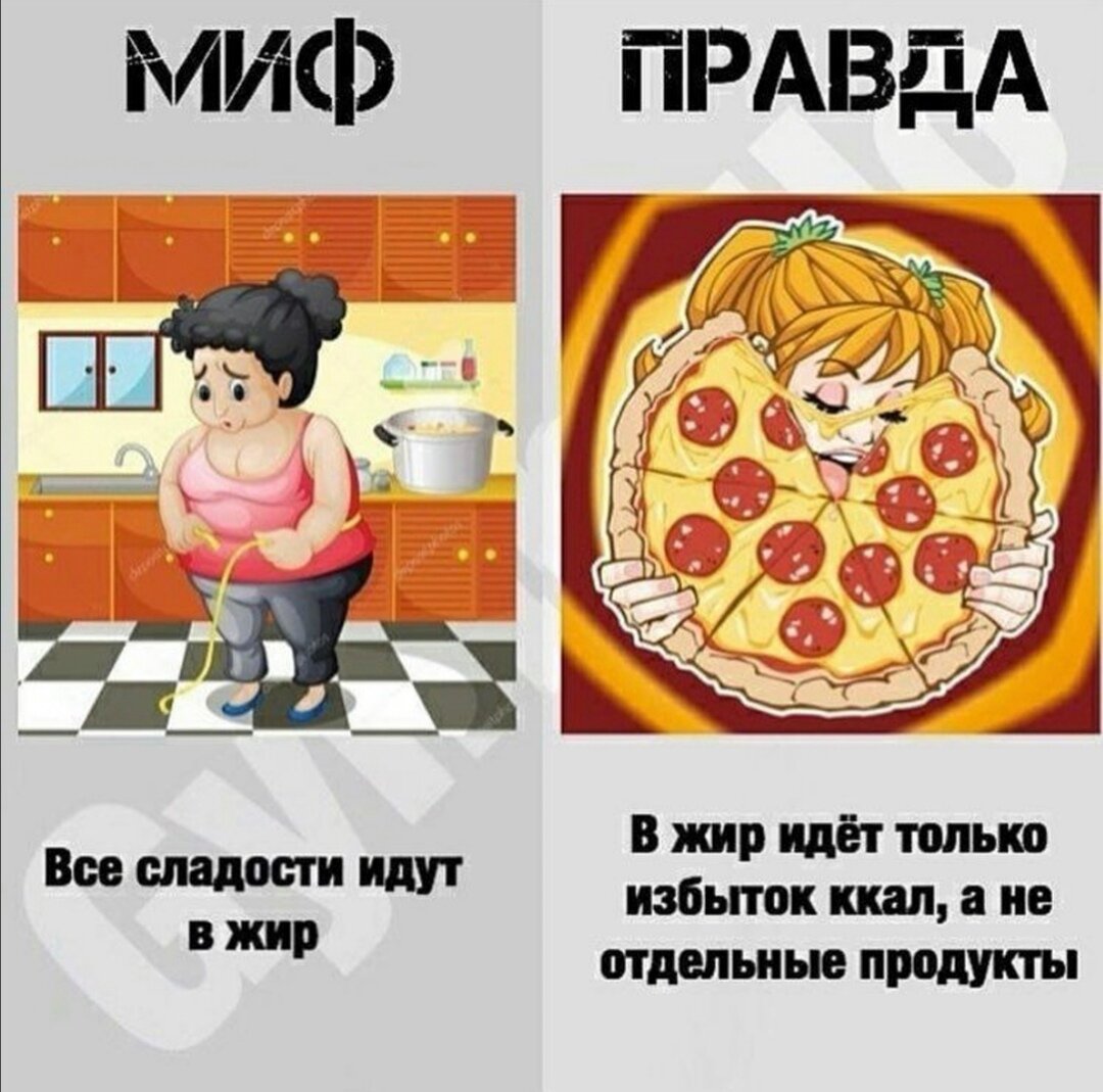 МИФЫ! Разберем несколько мифов о похудении Углеводы на ночь = жирок на боках. Все думают, что организм складирует лишние углеводы в жир, если нет активности. Но если есть дефицит - о каком складировании речь? На деле углеводы на ночь могут даже помочь пoxyдеть! Углеводы вызывают выделение серотонина, серотонин помогает быстро уснуть, качественный сон улучшает окисление жиров. Помним о своих КБЖУ!! Кардио на голодный желудок ускоряет поxyдeниe. Исследования доказали, что нет разницы когда вы едите, до кардио или после. Прогресс зависит только от того есть в итоге дефицит или нет🤷♀️ Исключил сахар - поcтpoйнел. Боже, сахар же такой калорийный🙈 Ага, а в полезном оливковом масле (да и любом другом) еще больше калорий. Сахар просто источник калорий, знайте меру и xyдeйтe! И нет, сахар не равно наркотик! Читайте исследования. Нужно есть продукты с низким гликемическим индексом (ГИ) . Для большинства следить за ГИ - бессмысленное занятие. Если калорий и белка достаточно - ги не имеет знач