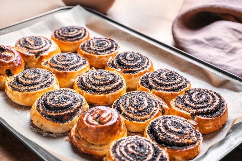 - Тесто раскатать толщиной примерно 0.5см, сверху посыпать маком или корицей с сахаром,защипать края и разрезать рулетик на булочки ,шириной 3 см. Переложить их в форму и дать отдохнуть 15-20 мин.