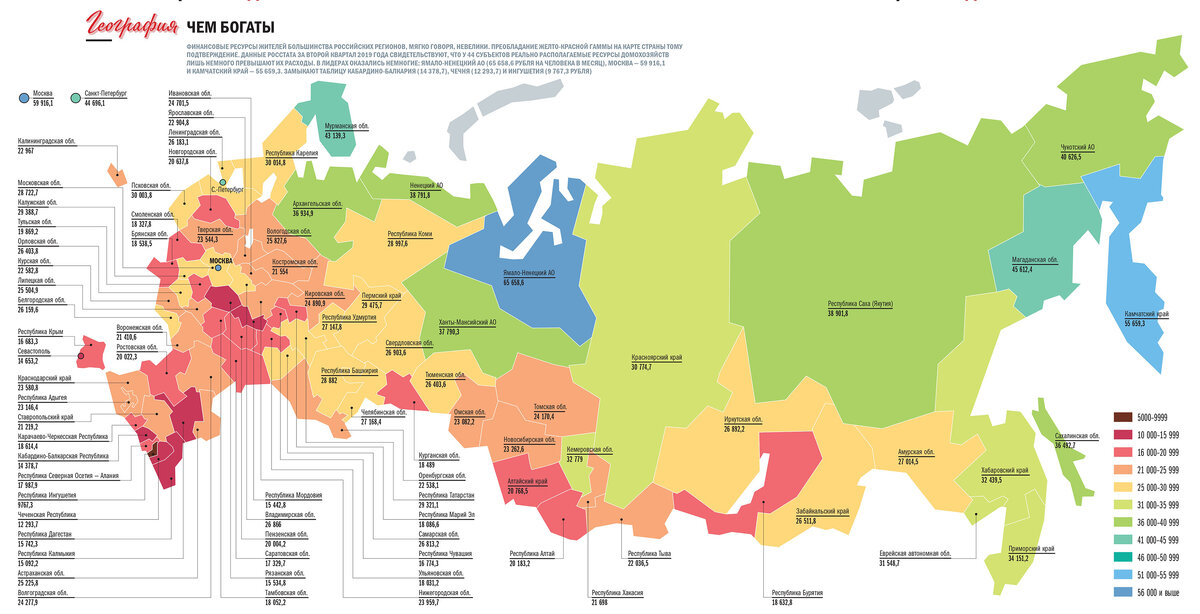 Росстат провел исследование реально располагаемых доходов домохозяйств во 2 квартале 2018 года. Картина получилась удручающая! В 44 регионах доходы очень незначительно превышают расходы. География располагаемых доходов по регионам РФ - чтобы увидеть подробности, увеличьте изображение, нажав на лупу в курсоре, открыв его по ссылке сверху. Где окрашено в желто-красную гамму, там доходы на одного человека не превышают 30 тысяч рублей в месяц. Жители 44 регионов страны, которых можно отнести к экономически благополучным, сегодня располагают ресурсами до 25 тысяч рублей в месяц. Регионы - лидеры по доходам населения Например, у жителей Ямало-Ненецкого АО объем ресурсов исчисляется 65 658,6 рубля, а расходы на потребление — 38 786,7 рубля. Жителям Камчатки приходится отдавать ежемесячно 29 430,9 из 55 656,3 рубля. Жителям Москвы — 35 036,5 из 59 916,1. Вроде как остается немало — более 20 тысяч рублей на человека! Однако за рамками учтенных расходов остаются налоги, штрафы и иные с