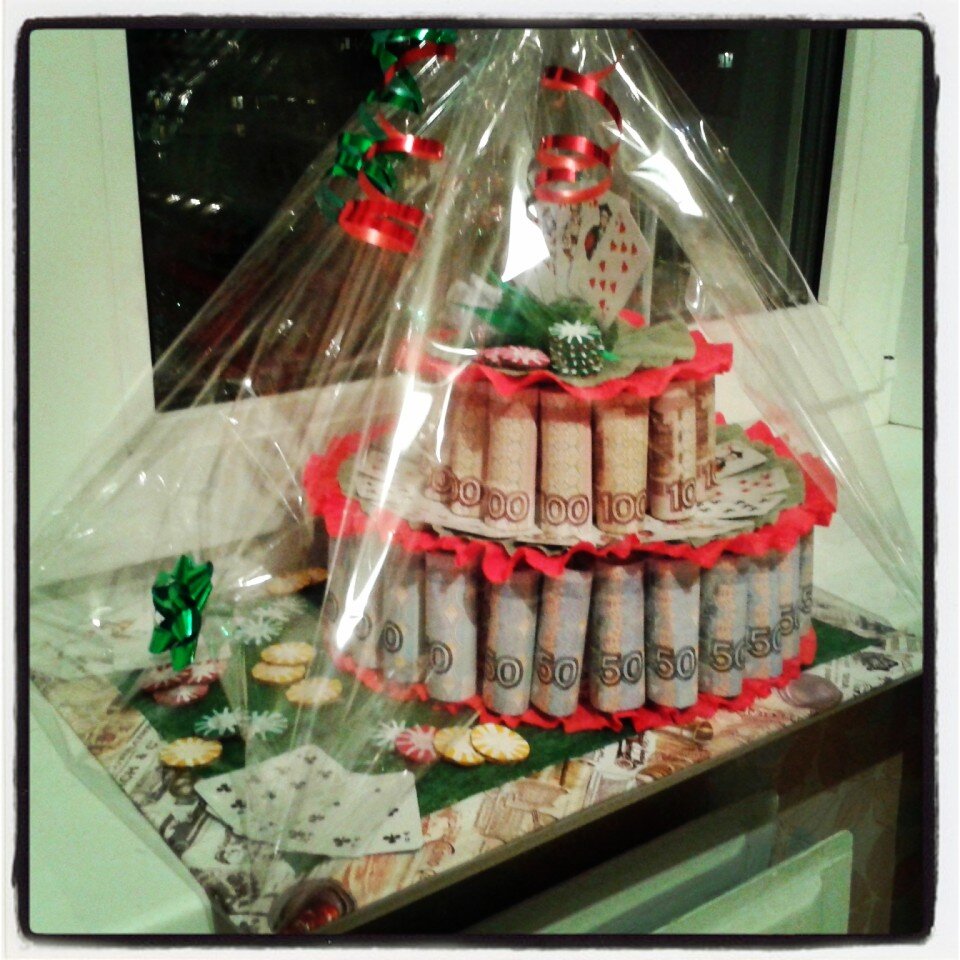 Разбирая архивы с фотографиями, наткнулась на серию фотографий пошагового процесса создания подарка своими руками. Хочу поделиться. Если вы не знаете, что подарить имениннику, то как в песенке Слепакова: "лучший подарок - конечно же это деньги". Но деньги тоже можно дарить по-разному. Можно просто вложить в конверт, а можно заморочиться и помимо практичной части создать еще эстетически приятную. Для создания такого "торта" мне понадобилось 3000р (разменянной на купюры номиналом 100 и 50 рублей), лист плотного картона, обёрточная и гофрированная бумага, кусок зеленой ткани для имитации сукна, ватман для основы слоёв, скрепки и колода миниатюрных игральных карт. А так же клеевой пистолет и несколько стержней клея. Ну и свободный вечер. Из ватмана я скрутила 2 круглые коробки разного диаметра по типу шляпных, с крышками сверху, в которых сделала равномерные прорези, чтобы в их можно было продеть скрепки, на которых будут держать свёрнутые купюры. Затем задекорировала крышки коробок г