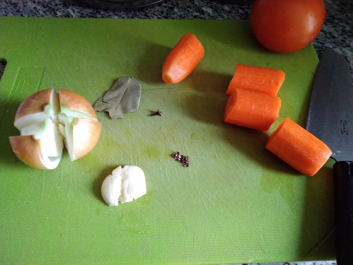 В нашей морозилке всегда (ну ладно, почти всегда) лежит замороженный бульон. Обычно - традиционный, куриный. А тут я сподобилась и сварила овощной - ничуть не хуже, а по некоторым параметрам даже лучше. Его можно использовать как основу для супов или как напиток: захотели вечером есть - пожалуйста, кружечка овощного бульона. Хоть после шести, хоть до и после полуночи. :) Итак, обязательные ингредиенты: Еще, конечно, хорошо иметь коньяк, но у нас как-то его пока не завелось, обходимся без. А также без кореньев - петрушки, пастернака, сельдерея. С ними лучше. На фото ниже - продукты на 2-2,5 литра бульона. Морковь делим на кусочки, хоть вдоль - хоть поперек, как ваше эстетическое чувство подсказывает. Можно не использовать целую морковку. Я обычно собираю "жопки", которые остаются после натирания моркови для салата или зажарки. Точно так же откладываю стебли укропа и петрушки - лежат себе на салфеточке, сохнут, а как время подошло - я их в бульон. Луковицу очищаем не до конца, последний