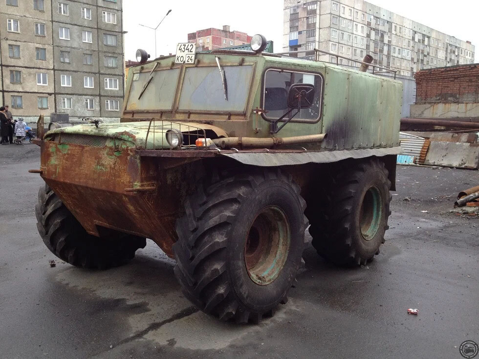 Пришла пора вновь познакомить вас с порцией самодельных вездеходов из России. Уверен, что некоторые из вас вдохновятся ими и захотят себе построить что-то похожее. Перед нами нечто страшное и ужасное. Двухосный вездеход, собранный из деталей множества автомобилей. Я точно вижу капот от УАЗика и кабину от старого КрАЗа. Остальной кузов, кажется, сделан вручную. В основе вездехода — стальной бронекузов, в котором находятся все узлы и агрегаты. Поворот осуществляется за счет бортовых редукторов, как на БТР. Очень надеюсь, что это действительно бронекузов, а не какой-нибудь мусорный бак для крупногабаритного мусора... Как только не издеваются люди над бедными "Жигулями". В этот раз кто-то превратил ВАЗ-2106 в гусеничный вездеход. Шасси полностью самодельное и использует самые обычные автомобильные колеса в качестве опорных катков. Кузов от "шестерки" водрузили сверху, заделав колесные арки листами нержавейки. Получилось страшненько, но довольно функционально, скорее всего. Перед нами самод