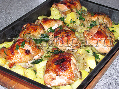 Нужные продукты собраны. Теперь начинаем процесс приготовления курицы с картошкой в духовке. 1. Курицу тщательно промываем под проточной водой и складываем в глубокую сковороду. Для приготовления можно взять голени или бедрышки. А мож