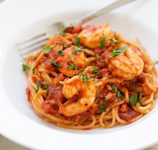Ингредиенты: 350гр морепродуктов (можно взять морской коктейль); 8шт помидор; 2шт зубчика чеснока; 1 пучок петрушки; 2ст.л белого вина; Соль, перец, оливковое масло по вкусу. Способ приготовления: Промойте морепродукты,опустите в кипяток максимум на 1-2 минуты,чтобы их не переварить. В этом же бульене можно сварить и пасту для нашего блюда. В ступке разотрите петрушку,чеснок, оливковое масло и соль, перец. Отдельно в сковороду обжариваем мякоть помидора,затем добавляем вино и перец Чили,совсем немного,ну на ваш вкус,это уже кто как любит. Тушем на медленном огне в течение 7 минут. Затем добавляем смесь с петрушки,томим три минуты. Затем разложите по тарелкам готовую пасту, сверху полейте соусом и выложите готовые морепродукты. Приятного аппетита!!!!!!
