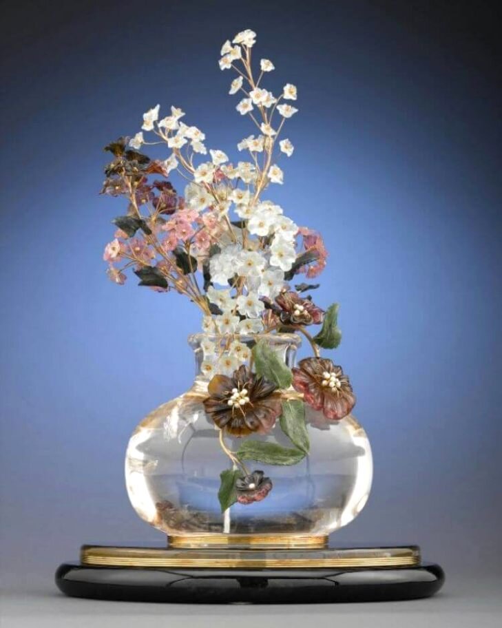 О пасхальных яйцах Фаберже наслышан определенно каждый. А вот о том, что он при помощи камня создавал еще цветы, известно не каждому. Однако знатоки ювелирных работ цветы Фаберже из камня считают самым настоящим шедевром. Изготовление цветочных композиций в необычном виде Фаберже подсказал Восток. Все началось с починки интересного изделия – букета хризантем, родом из Китая. Прозрачность камней и тонкое сочетание оттенков оставили неизгладимое впечатление на художника. Именно после этого букета Фаберже захотелось создавать цветочные композиции из камня. Он придумал немало вариантов и воплотил в жизнь множество идей. Его драгоценный гербарий до сих пор поражает и восхищает своей изысканностью и великолепием. Стоит отметить, что его работы не были обычной фантазией, он подходил к делу основательно. Чтобы создать цветок, он изучал живые растения, которые стали выращиваться в построенным с его подачи теплицах. До наших дней дошли рисунки с эскизами выращенных растений и служившими источн