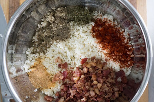 Вам понадобится: Измельченная цветная капуста 300г Натертый сыр Чеддер 100г Крупное куриное яйцо 2 шт Бекон ( слайсы, порезанные ) 7 шт Миндальная мука 25г Сыр Фета 25г Разрыхлитель половина ч. ложки Чесночный порошок две ч. ложки Сельдерей две ч. ложки Орегано две ч. ложки Паприка две ч. ложки Соль и перец по вкусу Способ приготовления Шаг 2 Добавьте 2 яйца и тщательно перемешайте, пока смесь не начнет держать форму Шаг 3 Разложите смесь в формочки для кексов Шаг 4 Посыпьте сыром Фета.