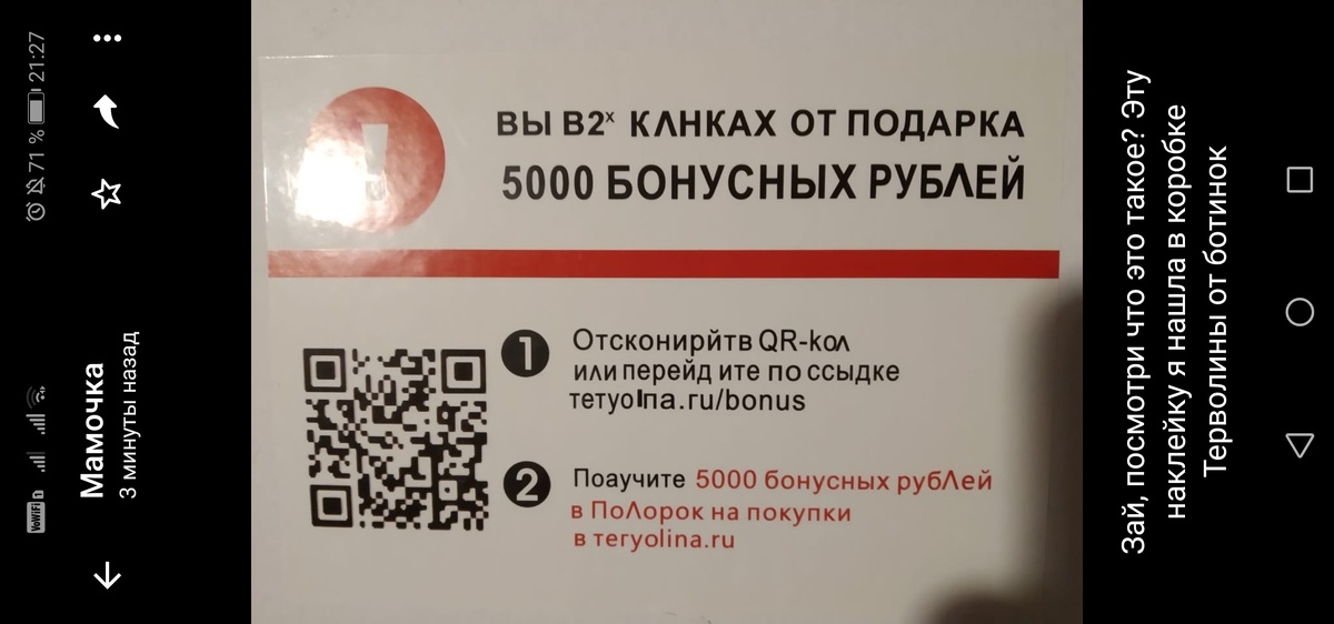 Недавно моя мама зашла в любимый магазин Терволина и снова не смогла уйти без покупки. Сейчас в этом магазине обуви как раз максимальные скидки и она прикупила себе зимние ботинки на меху. Конечно похвалилась мне о покупке. Но сегодня прислала сообщение, что нашла в коробке такую карточку, к слову говоря моя мама всегда перестраховывается и спрашивает у меня о странных сообщениях или звонках. Но такое я вижу в первый раз. Как думаете с какой целью это подкладывают? Ведь явно и очевидно, что сайт не магазина, а зачем сделаны такие ошибки в тексте?