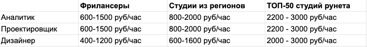 Стоимость часа аналитика, проектировщика, дизайнера в студиях и у фрилансеров
