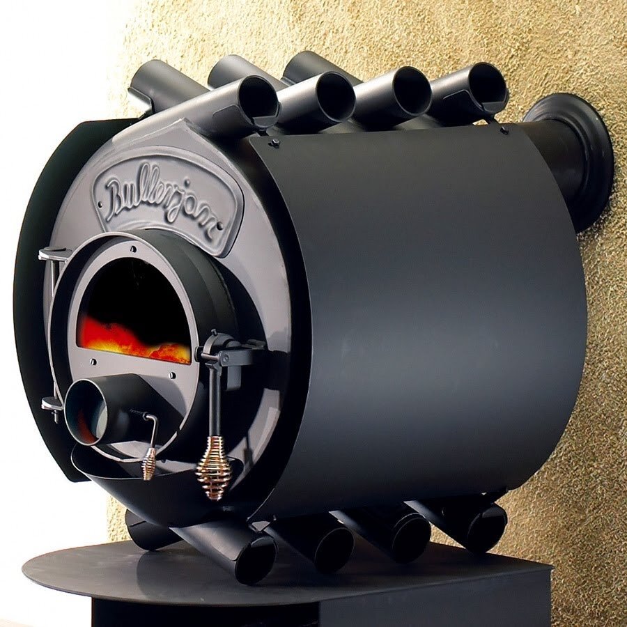 Как правило, отопительная печь длительного горения представляет собой рабочую топочную часть, обвитую вокруг трубами. Такая конструкция создает дополнительную циркуляцию воздуха: снизу в трубы засасывается холодный воздух, омывает печь и выходит нагретым сверху.