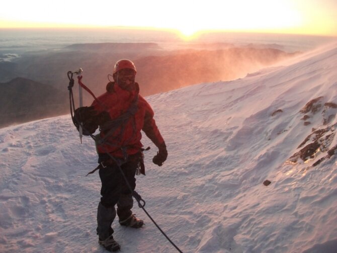 Снег. Ветер. Друг. Мысли, что я вернусь, я и мой друг, мы вернемся, дойдем до вершины и вернемся! Я: «Ну что? Вниз?». «Да…» - задыхаясь, ответил Леха. Я, также задыхаясь, говорю, что надо идти, давай вместе считать шаги. Хотя самому уже ничего не хочется. Хочется спать и никуда идти. Раз. Два. Три. Четыре. Пять. Шесть. Семь. Восемь. Девять. Десять. Отдыхаем. Облокачиваемся на ледоруб, воткнутый в снег, голову на руку с ледорубом, отдышался и пошел. Стало уже тяжело идти по десять шагов. Мысли повернуть назад перемешиваются с мыслями «Мы дойдем! Мы вернемся!». Тяжелая внутренняя борьба. Сколько времени я уже не знал. Мы уже вошли в ритм 10 шагов, отдышка, 10 шагов, отдышка, 10 шагов, отдышка... И вдруг, совершенно неожиданно, вот она вершина! Вернее кратер! Радость охватила нас обоих, из последних сил мы обнялись! Идти вверх больше не надо! Солнце приветствовало нас, и даже ветер, казалось, стал тише! Идем искать самую высокую точку кратера, проходим жандарм за жандармом. Вот стоит пирамидка, я ее видел в отчетах! Это она! Вершина! 5621 м. Время 12.40. На обеих вершинах никого, кроме нас, Одинокая связка и Эльбрус...