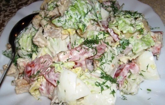 4. Все ингредиенты, кроме сухариков, смешать, слегка посолить, поперчить и заправить майонезом. 5. Перед подачей на стол, добавить сухарики, еще раз перемешать и посыпать рубленой зеленью. Приятного аппетита!