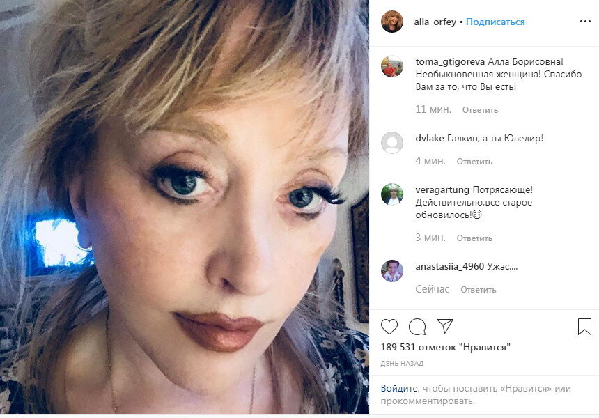За изменениями во внешности Аллы Пугачевой стало довольно трудно уследить, начиная с января этого года. На одних фотографиях 70-летняя певица выглядит похожей на свою дочь Кристину Орбакайте, а на других - на подругу Лайму Вайкуле. На праздновании юбилея Игоря Николаева, гости впервые оценили "новое" лицо Аллы Борисовны. Они заметили, что у Пугачевой стал лучше овал лица и чудесным образом исчезло большинство морщин. "Люди добрые, я старею, и достаточно резко. Организм дает сбой" — утверждала Алла буквально год назад, когда её, наоборот, обвиняли в утомившемся взгляде и печальном виде. "Мне трудно дышать, трудно ходить, но я ещё жива и должна жить ради маленьких детей. Желаю вам счастья и долгих лет жизни. Не старейте подольше ни душой, ни телом. Отправляйте свой яд и злобу на борьбу с проблемами, более важными, чем моё старение и немощь. Я всё равно в последние дни своей жизни буду думать о детях и о вас, которые своими аплодисментами делали мою жизнь насыщенной и прекрасной