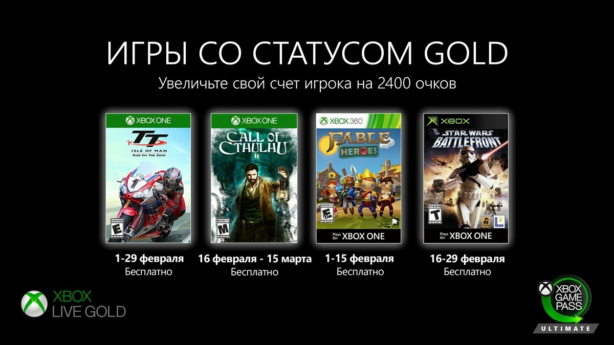 Объявлены игры по подписке Xbox Gold на февраль • TT Isle of Man — с 1 по 29 февраля • Fable Heroes — с 1по 15 февраля • Call of Cthulhu — с 16 февраля по 15 марта • Star Wars Battlefront (2004) — с 16 по 29 февраля
