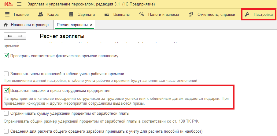 Подарки, которые организация выдает работникам следует подразделят на две категории. Первая - не связанная с вознаграждением за какие-либо трудовые заслуги. Согласно ГК РФ здесь стоит учитывать стоимость подарка. Если она составляет более 3 тыс. рублей, то необходимо заключить соответствующий договор между работником и организацией. Безопасный вариант заключить договор вне зависимости от стоимости подарка. Вторая – подарок, как вознаграждение за трудовые заслуги. В данном случае подарок будет считаться как часть оплаты труда, а передача его работнику будет происходить на основании трудового договора. Помимо договора дарения в данном случае, также необходимо издать приказ о поощрении по форме №Т-11 или по той форме, которая утверждена в организации и отражена в учетной политике. В программе учет данных операций автоматизирован. Смотрите бесплатно вебинары по 1С Первое, что необходимо сделать для оформления подарка сотрудникам в 1С ЗУП – это выполнить соответствующие настройк