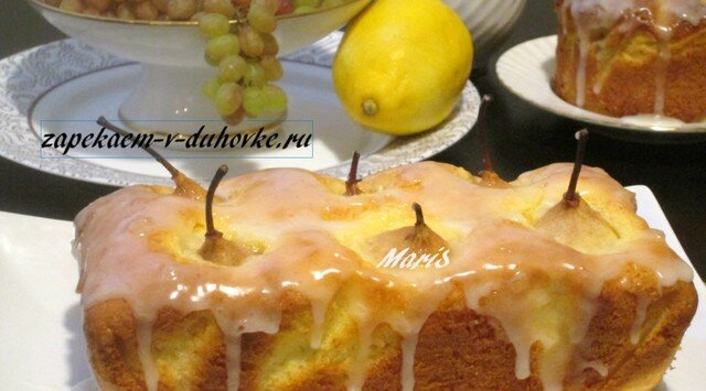 Это мой любимый кекс - нежный, воздушный, с запеченными целиком грушами и миндалем. В меру влажный, просто тающий во рту, с нежным ароматом миндаля и легким оттенком его вкуса. Глазурь на лимонном джеме, покрывающая кекс, не только его украшает, но и придаем десерту такую приятную кислинку.