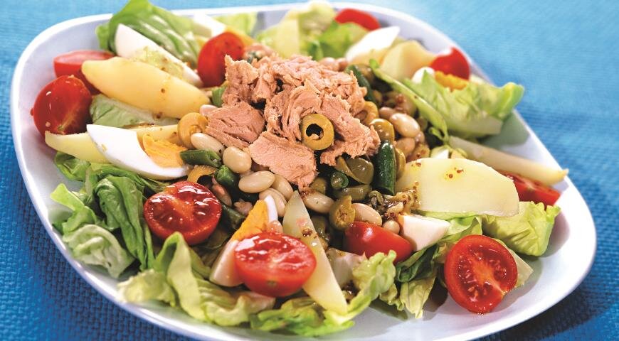 Ингредиенты: Для заправки: Приготовление: 1. Заранее приготовить заправку. Для этого соединить все ее составляющие в небольшой миске и перемешать венчиком. Фасоль опустить в кипящую воду и варить в течение 5 минут. Откинуть фасоль на дуршлаг и промыть ее холодной водой. 2. Разогреть 2 ложки оливкового масла, добавить раздавленную дольку чеснока, затем фасоль. Готовить несколько минут до мягкости. Посыпать петрушкой, снять с огня и дать полностью остыть. Полить оливковым маслом, чайной ложкой винного уксуса или лимонным соком. 3. Салат разобрать на листья, помыть и обсушить. Большие листья порвать в миску. Помидоры разрезать пополам вдоль, потом каждую часть на 2 или на 3 кусочка. Произвольно порезать сладкий лук. Маслины промыть и разрезать пополам. Сладкий перец почистить и порезать тонкими ломтиками. Яйца отварить, очистить от скорлупы и порезать на четвертинки. Анчоусы промыть в холодной воде. 4. В салатник выложить слоями свежий салат, лук, помидоры, фасоль и перец. Повто