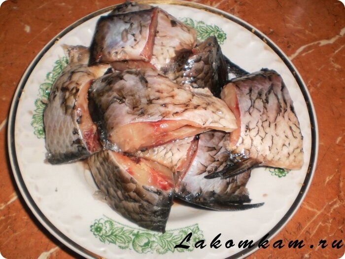 Приготовление консервов из карася в мультиварке. Очищенного карася нарезаем небольшими порционными кусочками.