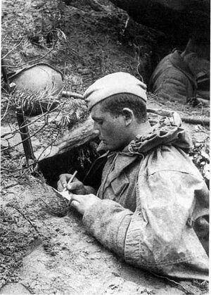 Открытое письмо, 1943 Ответ женщине, которая написала мужу о том, что ушла к другому. Письмо перехватили однополчане мужа и попросили Симонова написать ответ. Я вас обязан известить, Что не дошло до адресата Письмо, что в ящик опустить Не постыдились вы когда-то. Ваш муж не получил письма, Он не был ранен словом пошлым, Не вздрогнул, не сошел с ума, Не проклял все, что было в прошлом. Когда он поднимал бойцов В атаку у руин вокзала, Тупая грубость ваших слов Его, по счастью, не терзала. Когда шагал он тяжело, Стянув кровавой тряпкой рану, Письмо от вас еще все шло, Еще, по счастью, было рано. Когда на камни он упал И смерть оборвала дыханье, Он все еще не получал, По счастью, вашего посланья. Могу вам сообщить о том, Что, завернувши в плащ-палатки, Мы ночью в сквере городском Его зарыли после схватки. Стоит звезда из жести там И рядом тополь — для приметы... А впрочем, я забыл, что вам, Наверно, безразлично это. Письмо нам утром принесли.