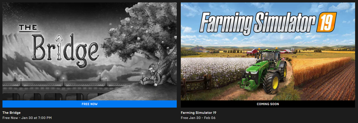 В цифровом магазине Epic Games Store сегодня стартовала раздача новой бесплатной игры. До вечера следующего четверга все желающие могутактивировать на свои аккаунты двухмерную инди-головоломку The Bridge. Успейте забрать The Bridge да 30.01.2020 до 7 утра Следующим же подарком магазина станет Farming Simulator 19. Популярный симулятор фермы от издательства Focus Home Interactive можно будет забрать в период с 30-го январяпо 6-е февраля. Бесплатные еженедельные раздачи в EGS продолжатся как минимум до конца 2020 года.
