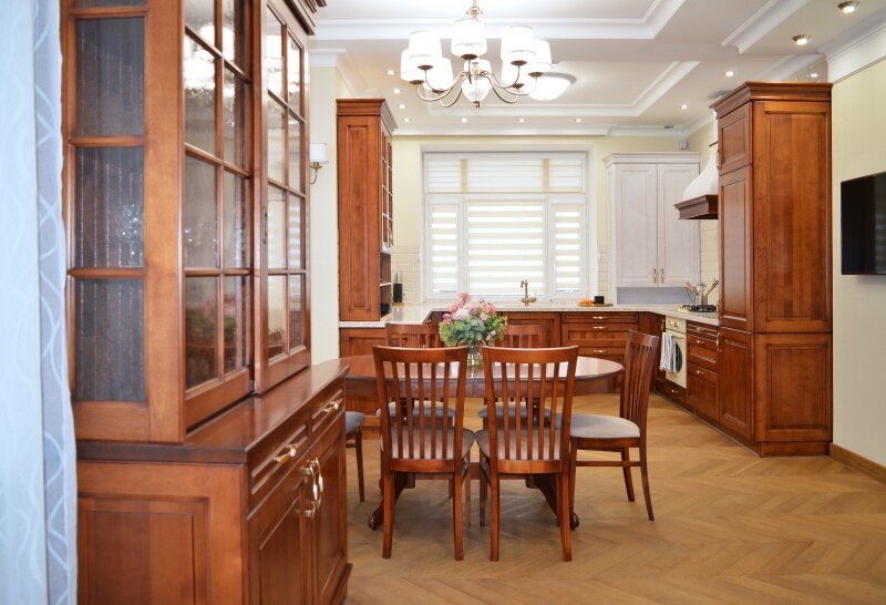 На фото кухня из массива, в классическом стиле. Прямые линии, симметрия, природная цветовая гамма, натуральные материалы - всё это присуще интерьерам в классическом стиле. Необычным этот проект делает отсутствие навесных шкафов. Давайте рассмотрим плюсы и минусы такого решения. + Кухня без навесных шкафов выглядит просторнее и светлее. + Кухня с одним ярусом будет стоить ощутимо дешевле, чем такая же кухня с двумя ярусами. + Для хозяек с невысоким ростом, высокие навесные шкафы не всегда удобны. И единственный минус кухни без навесных шкафов - это уменьшенное пространство для хранения кухонной утвари. В данном проекте отсутствие навесных шкафов компенсируют буфет и настольные полки, глубокие угловые шкафчики в нижнем ярусе оснащенные выдвижными системами. Есть ещё одна хитрость в этом проекте. В светлой, практически невидимой, настольной полке, за глухими фасадами, скрывается вовсе не посуда, не полки для хранения продуктов... Там скрыт от посторонних глаз водонагреватель и коммуни