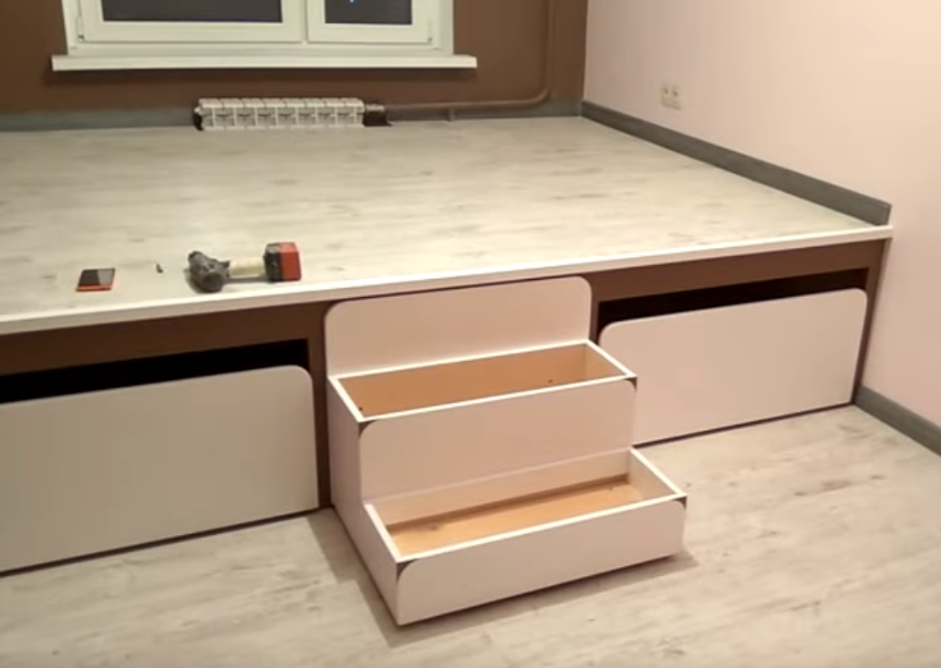 Разделить подиумы на варианты можно в первую очередь по типу их устройства. Собрать подиум можно как по каркасному, так и по монолитному типу. Второй метод уместен при ремонте в частном доме, поскольку монолитный подиум много весит и создает серьезную нагрузку на перекрытие.