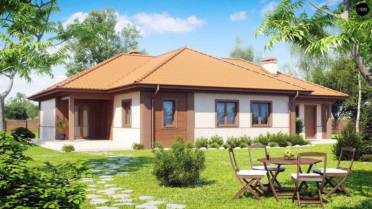 Проект Z22 — это комфортный одноэтажный дом традиционного дизайна с четырьмя спальнями, с гаражом, многоскатной крышей и двумя угловыми крытыми террасами. Преимущества проекта Z22: Понравился проект? Пишите комментарии. Посмотреть другие проекты вы можете на сайте.