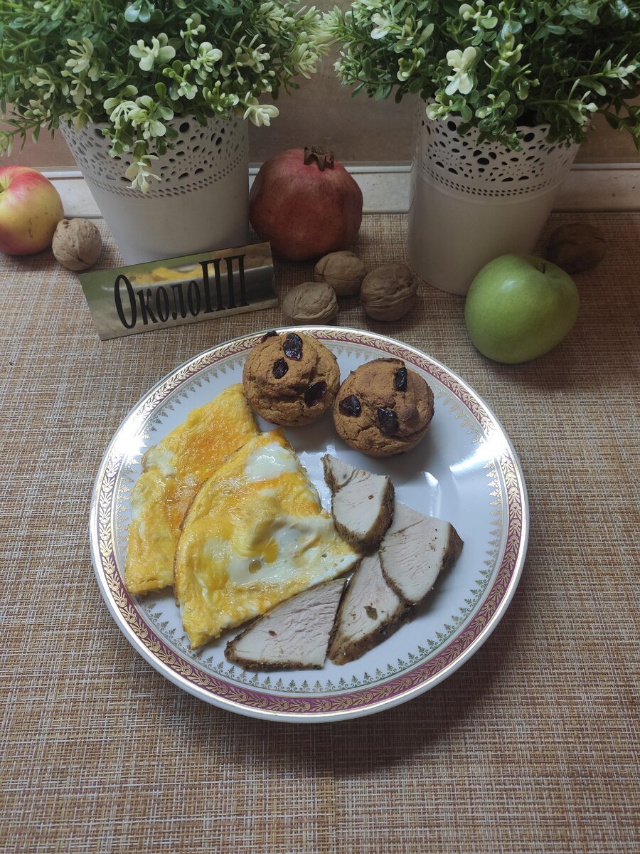 На завтрак у меня сегодня полный набор: и яичница из двух яиц, и 50 г пастромы из индейки, и яблочные кексы (95 г) с зеленым чаем.