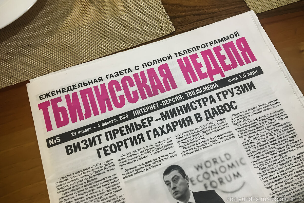 Если честно, я совсем не ожидал увидеть в Грузии газету на русском языке, но именно такую я встретил в Тбилиси. Газета называется "Тбилисская неделя" и все статьи в ней написана на русском языке. Мне стало интересно и я купил эту газету. Показываю, о чем там пишут и что читают в русскоязычной газете местные грузины. Газета стоит 1,5 лари, это как целый килограмм мандарин. Несмотря на достаточно высокую для местных стоимость, газеты выходит каждую неделю и местные активно ее покупают. Как рассказала пожилая продавщица, берут эту газету в основном пенсионеры, которые привыкли узнавать новости из газет. А именно эта газета выходит на русском еще и потому, что в Грузии живет много русских, украинцев, армян и выходцев из других бывших советских республик и всем им удобнее читать именно на русском. В газете рассказывают про крупные политические новости, как премьер-министр съездил в Щвейцарию, а президент в Израиль. Международная страничка представлена новостями о китайском вирусе. Пишут, чт