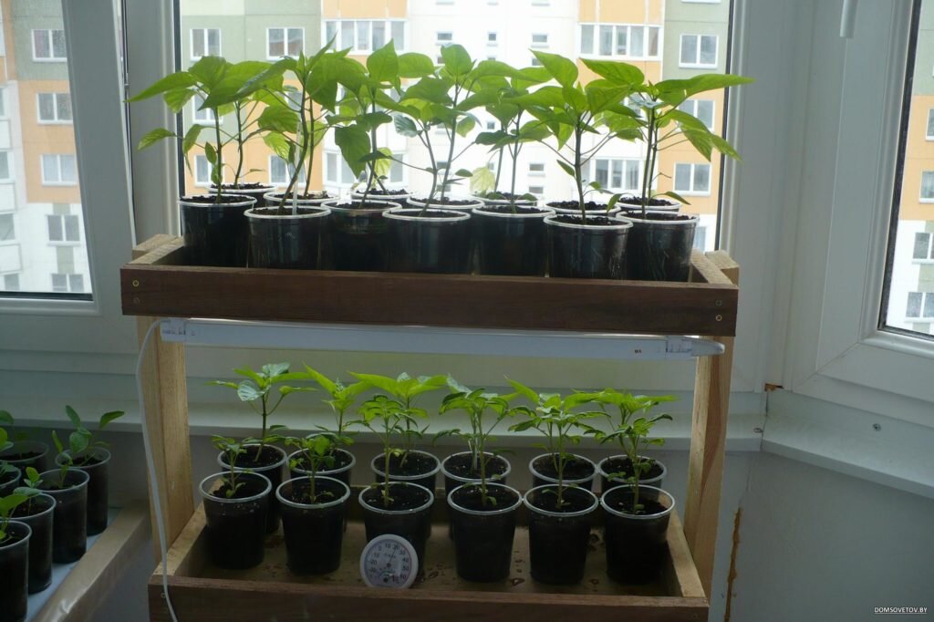 Для возделывания овощей в зимне-весенний период особенно хороши восточные и южные окна. Менее пригодны западные и углубленные лоджии, но и на них можно получить урожай, только надо начинать выращивание овощей на 2— 3 недели позже, чем на восточных и южных или пользоваться подсветкой. Световой день при этом не должен превышать 12 часов, В пасмурную погоду подсвечивают непрерывно, в солнечную — только в утренние или вечерние часы. Используют лампы накаливания, или дневного света по 80— 100 Вт/м2. Их устанавливают над растениями на высоте примерно 35 см (не ниже), не допуская перегрева листьев.