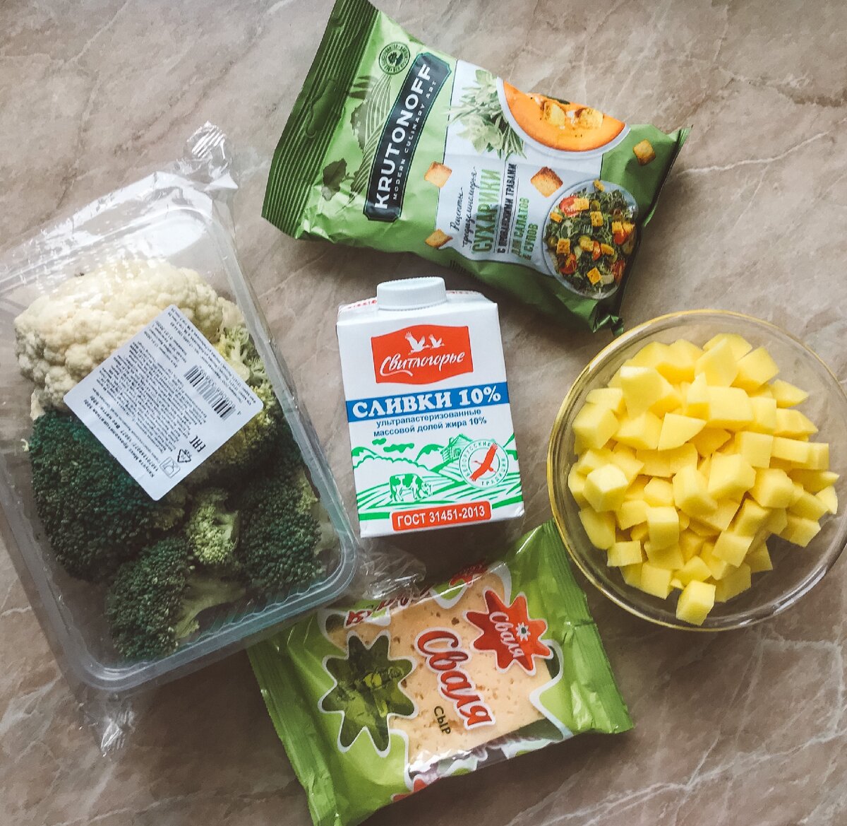 Ингредиенты 🥦Брокколи - 200 г 🥦Цветная капуста - 200 г 🥦Картофель - 2 шт 🥦Репчатый лук - 1 шт 🥦Сыр - 50 г 🥦Сливки 10% - 60 г 🥦Чили молотый - по вкусу 🥦Рыба (лосось) - 300 г 🥦Гренки - по вкусу Приготовление Ставим вариться. Приятного аппетита! 🥰