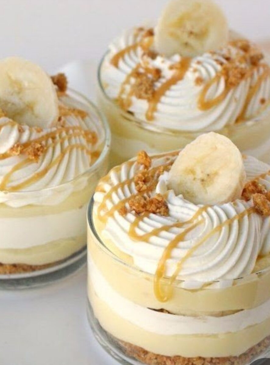 Ингредиенты: Банан – 2 шт Карамельный соус Взбитые сливки Для крема: Сахар – 2/3 стакана Крахмал – ¼ стакана Соль – ½ чайной ложки Молоко – 3 стакана Яйцо – 2 шт Сливочное масло – 2 столовых ложки Ванилин – 1 столовая ложка Печенье или несоленые крекеры – 10 шт Сливочное масло – 70 Сахар – 1 столовая ложка Приготовление: Крем: В миске взбейте яйца вилкой. Сахар, крахмал и соль смешайте в небольшой кастрюльке. Постепенно влейте молоко и, помешивая, поставьте на средний огонь до загустения. Доведите до кипения. Продолжайте готовить еще около минуты. Добавьте пару столовых ложек этой смеси в миску с яйцами и немедля быстро и тщательно перемешайте, чтобы яйца не скрутились. Затем перелейте взбитые (подготовленные) яйца обратно в кастрюлю.Поставьте на маленький огонь и около минуты дайте покипеть, периодически помешивая. Снимите с огня, добавьте сливочное масло и ванилин. Оставьте остывать. Когда кастрюля остыла, поставьте ее в холодильник для полного охлаждения (можно закрыть пищевой пле