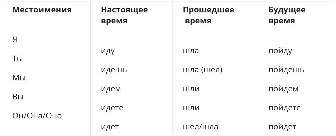 Возьмем глагол «идти» в инфинитиве (неопределенная форма глагола, отвечающая на вопросы: Что делать? Что сделать?)