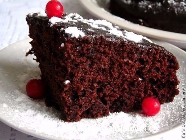 Ингредиенты: Мука — 1,5 стакана Какао — 3 ст. л. Сливочное масло — 100 г Сахар — 0,5 стакана Вода — 1 стакан Лимонный сок — 1 ст. л. Растворимое кофе — 0,5 ч. л. Сода — 1 ч. л. Соль Ваниль Для крема-глазури: Молоко — 2 ст. л. Какао — 1 ст. л. Сахар — 2 ст. л. Сливочное масло — 20 г Вода — 2 ст. л. Крахмал — на кончике ножа Приготовление: 1. Для приготовления тортика нам понадобятся две миски. В одной мы будем смешивать сыпучие ингредиенты, в другой — мокрые. 2. Сыпучие: смешиваем муку, какао, соду и соль. 3. Мокрые: сахар, растопленное масло, воду, лимонный сок и кофе. Перемешиваем. 4. Теперь аккуратно вливаем мокрые ингредиенты в сухие, замешивая тесто. Чем больше вы будете взбивать тесто, тем лучше. Тесто получается жидковатое. Переливаем его в форму и отправляем выпекаться 40 минут при температуре 180 градусов. 5. Тем временем приготовим крем-глазурь. Для этого смешаем все ингредиенты, кроме крахмала. Его нужно отдельно развести водой. Когда шоколадная смесь закипит, прикрутим о