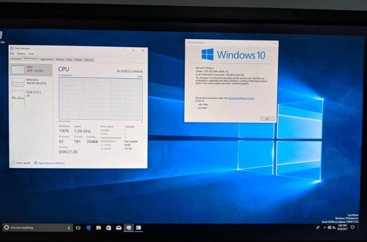 Обычная версия Windows 10 1709, с поддержкой эмуляции x86 программ. Правда, удалось задействовать только одно ядро из четырех, ровно как и 1 ГБ ОЗУ из четырех. В итоге все работало очень медленно, но, очевидно, есть куда расти.